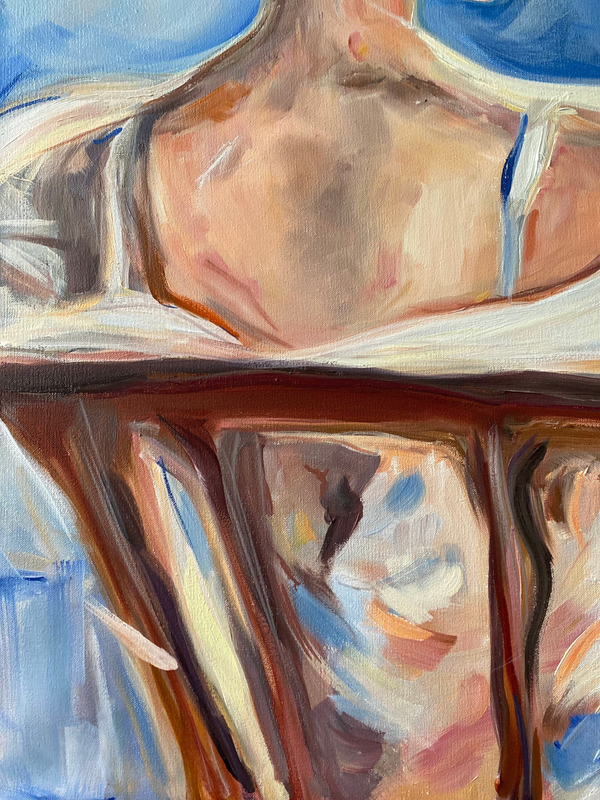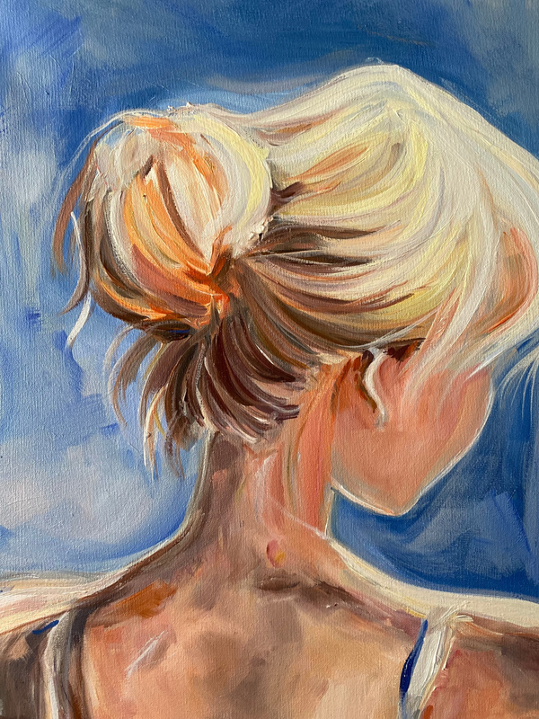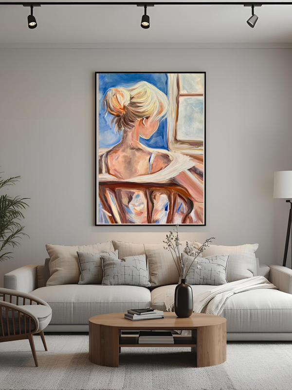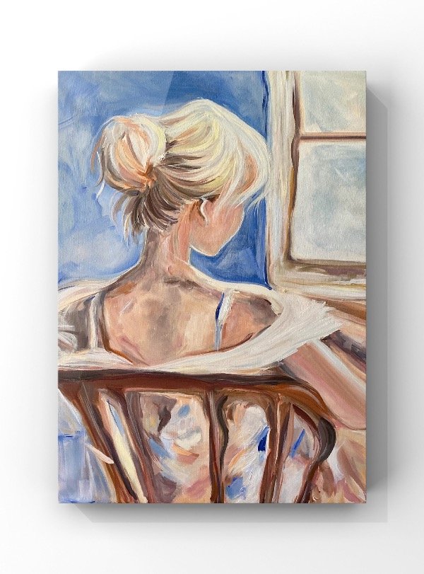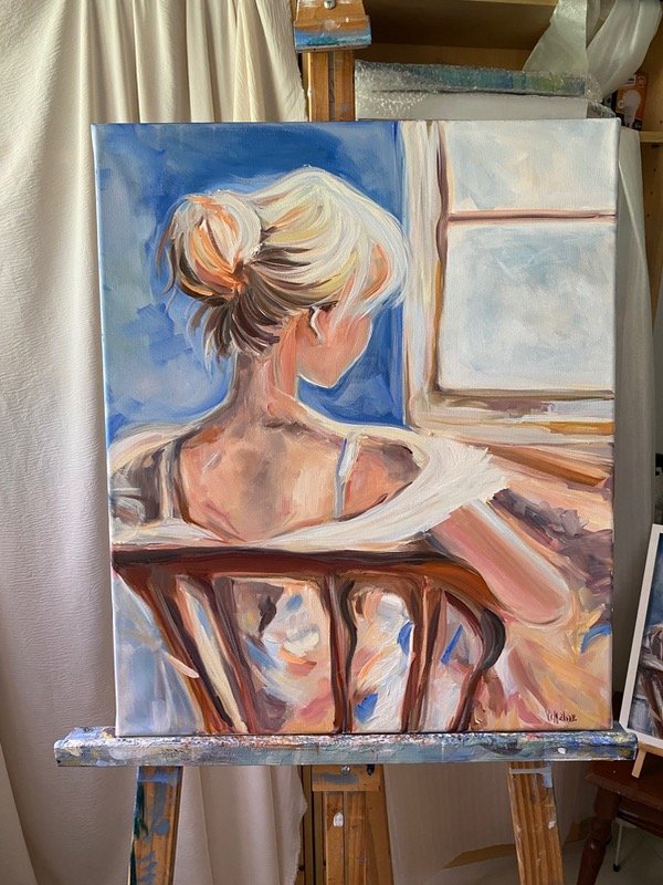 Nueva versión de Pensamiento en la ventana, en óleo de 50x60 cm. Trabajo por encargo. Vendida.